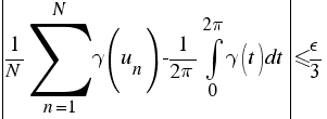 <m 16>delim{|}{{1/N} sum{n=1}{N}{gamma(u_n)} - 1/{2 pi} int{0}{2 pi}{gamma(t) dt}}{|} <= epsilon/3</m>