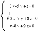 <m>delim{lbrace}{matrix{3}{1}{{3x-5y+z=0} {sqrt{2}x-7y+8z=0} {x-8y+9z=0}}}{ }</m>